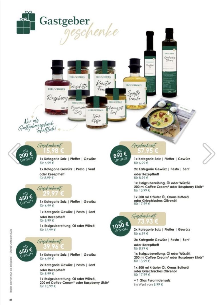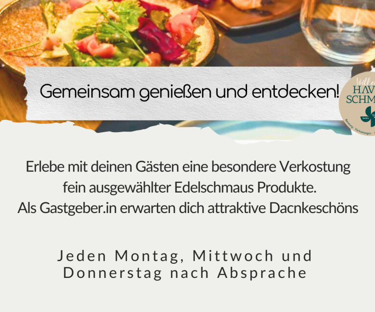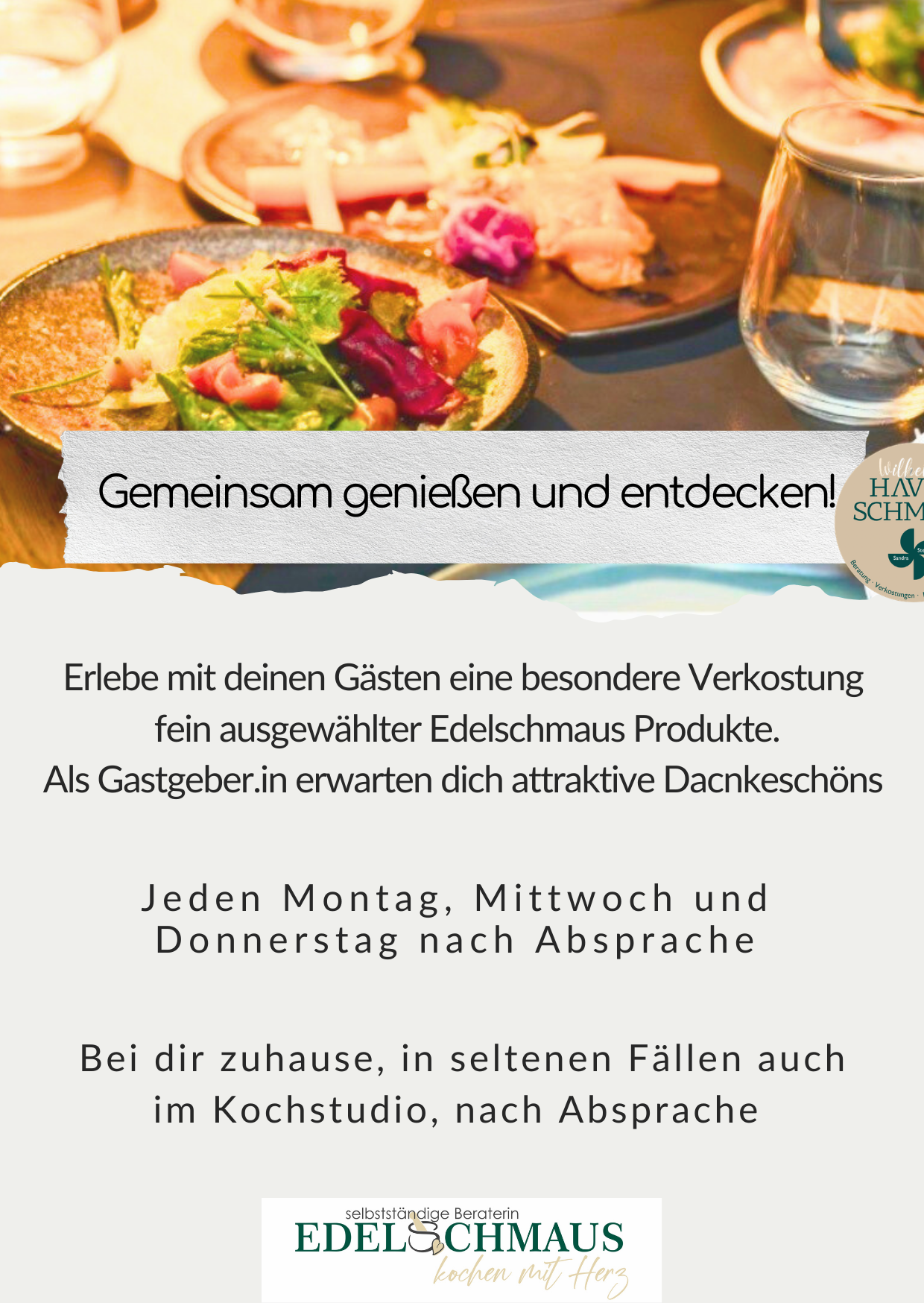 Als Dankeschön für deine Gastfreundlichkeit wirst du mit kostenlosen Edelschmaus Produkten beschenkt. Lass Dich überraschen und wähle aus unserem Gastgeberprogramm bis zu 6 Geschenke. Die Verkostung an sich ist kostenfrei.